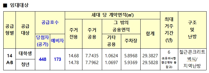 이번 공고에서는 14 A형, 14B형 두 형별만 공급하며, 대상자는 대학생 계층, 청년 계층 총 두 계층입니다. 신혼부부 및 고령자 등은 이번 공고에서 모집하지 않습니다. 현재 14형 공가인 448호와 예비 입주자 173호로 총 621호를 모집합니다.